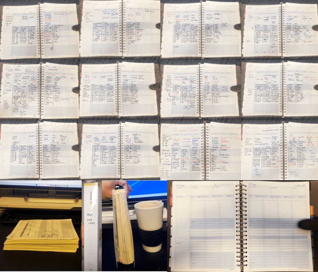 Throughout my PhD, I documented everything—daily plans, experiments, reflections—until my notes grew as thick as a coffee cup. My mornings began between 4:00 and 5:00 AM, fueled by McDonald’s coffee or Monster Energy drink. These early hours, my peak focus time, were dedicated to research, experiments, and paper reading. I repeated this for years. Time accumulated, and so did results.
