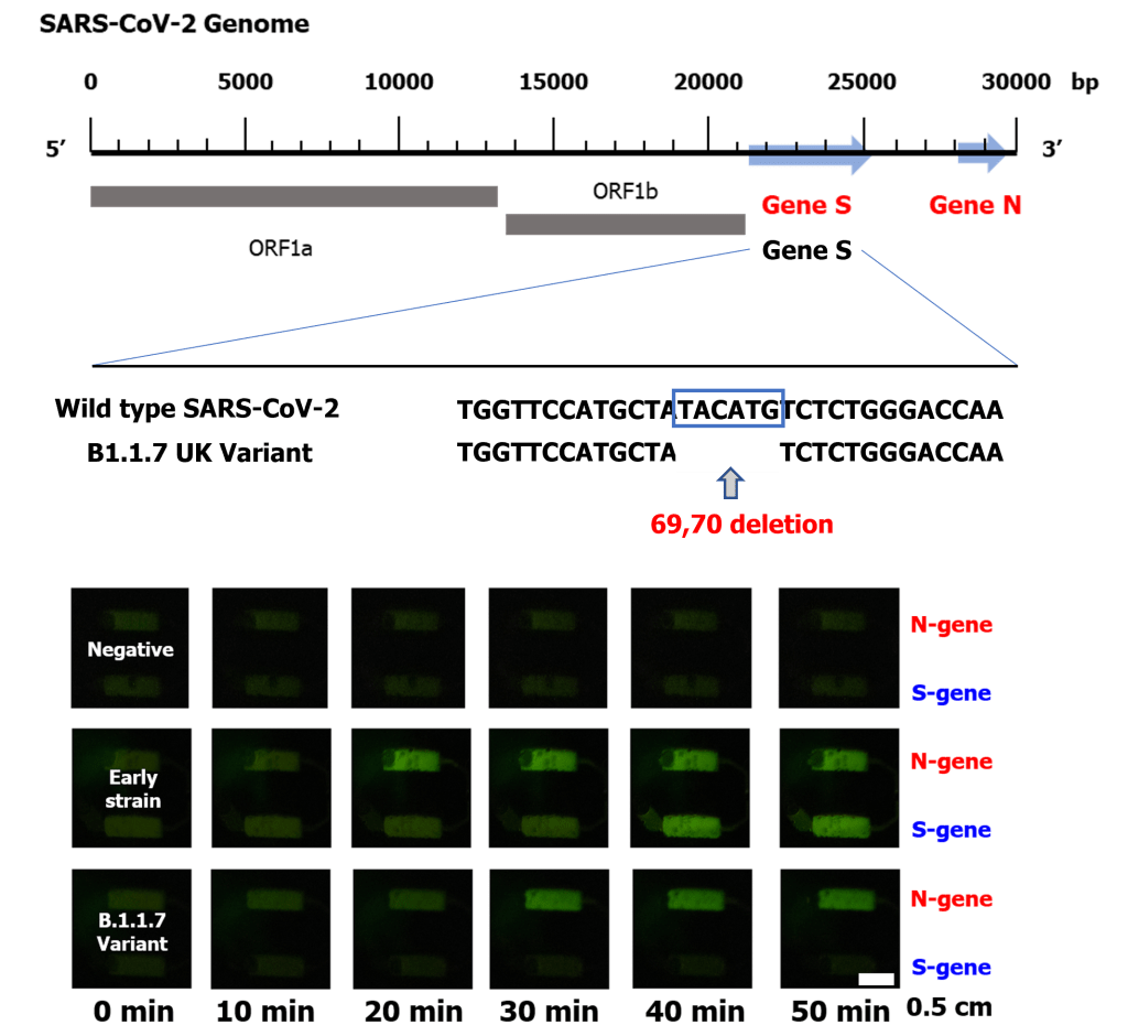 - First demonstration of the portable system that enables simultaneous detection of SARS-CoV-2 virus and its variant discrimination ability using LAMP