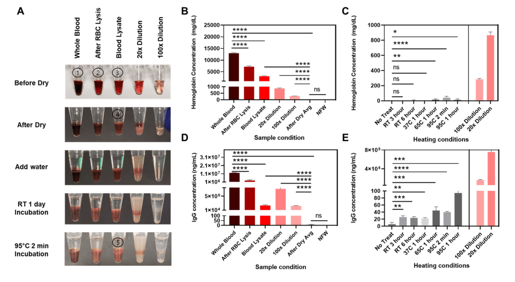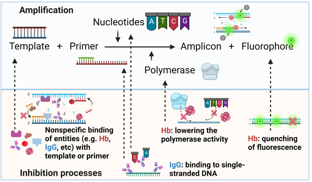 - Major inhibitors, such as hemoglobin and IgG, are inactivated since they are physically trapped within the dried blood matrix, without being released out